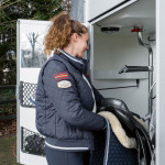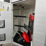 New Style -English Saddle Cupboard – accessible from both outside & inside the trailer with – telescoping racks for 2 English Saddles, shelf, light, blanket rack, broom, shovel, mirror on door, hooks,