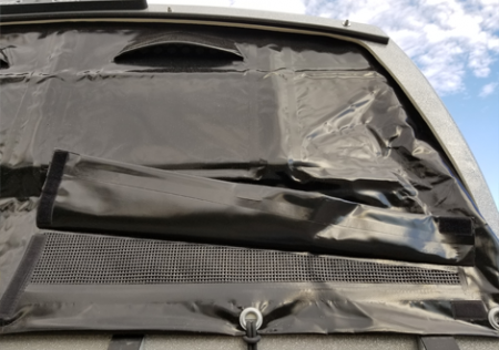 A uniquely designed polyester roof changes the air flow. This shape reduces drag, minimizing fuel consumption and the chance of sway. Grand Master models have a built in “hill” for the air to flow over, pulls the air into the trailer through the roof vent. The air flows out the back through the wind screen or fully opened storm canvas, keeping the trailer temperate. A curved rear roof line and built in spoiler complete the aerodynamics.
