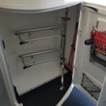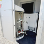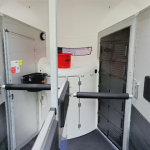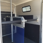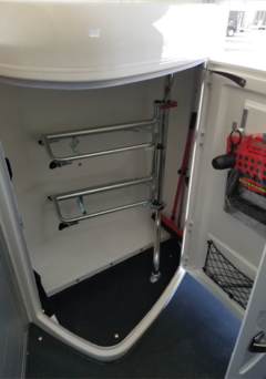 Lockable Tack Locker with access from Driver-side of trailer. Includes 2 wide Saddle racks, that swing out to the entrance door for easy access + Kit ( broom & shovel), light, stool, crop holder and multiple hooks.