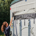 A uniquely designed polyester roof changes the air flow. This shape reduces drag, minimizing fuel consumption and the chance of sway. In Portax models, a built in “hill” for the air to flow over, pulls the air into the trailer through the roof vent. The air flows out the back through the wind screen or fully opened storm canvas, keeping the trailer temperate.