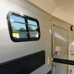 Safety first for our horses with adjustable stall bars to ensure a comfortable stall fit. Added side wall pads, chest bar foam covers and bright white interior create a comfortable space. Smooth surfaces and rounded corners reduces opportunity for injury. Even the curved door handle designs reduce tangles with lead lines. Tinted pop-out windows, an optional roof vent + a built in wind screen increase air flow through the trailer.