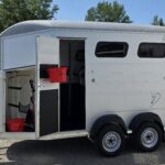 7’8″ Internal Height, Total Trailer Length: 17’6″, Straight Load 2 horse – 18 hands, Two 33″ wide stalls,