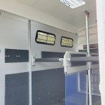 Lower anti-glare front window, added magnetic stall panel holders, added front rubber mat for wear protection against pawing horses or horses that wear corks/road studs are all excellent standard features. The standard horses stalls can accommodate horses that wear up to an 84″ blanket (Longer horses can have a longer stall- trailer must be ordered at factory for that option.) The two Portable feed buckets are standard, as are the broom, shovel and step stool found in the tack locker. Hay net rings on the side walls, for each horse, plus trailer tie loops. Two sliding lateral windows + a roof vent + rear storm canvas with integrated screen makes for a super airy trailer in transit.
